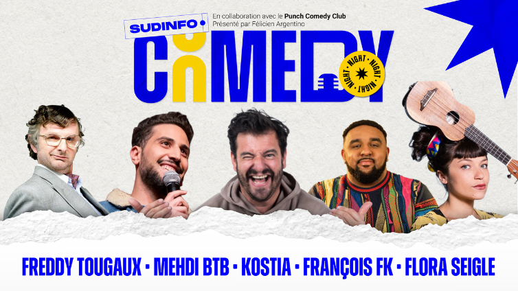 Après trois premières éditions mémorables, la Sudinfo Comedy Night revient avec une nouvelle brochette d’humoristes prêts à enflammer la scène ! Une heure de fous rires garantis avec Freddy Tougaux, Mehdi BTB, Kostia, François FK et Flora Seigle ! Le tout animé par Félicien Argentino du Punch Comedy Club.